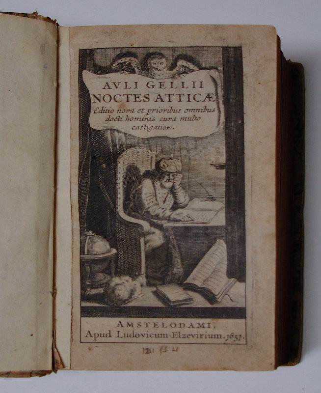 12mo. (XLVIII),498,(122 index) p. 19th cent. marbled boards. 13 cm (Ref: Neue Pauly, Suppl. 2, p. 261; Willems 1127: ‘Édition fort jolie et qui passe pour très correcte’; Berghman 2065 ; Rahir 1145; Graesse 3,46; Ebert 8287; Dibdin 1,340/41; Fabricius/Ernesti 3,10: ‘emendatissima editio’; Schweiger 2,378: ‘Neue, werthvolle Recens. nach Handschr. von Jo.Frd. Gronovius’; Brunet 2,1524: ‘Jolie édition’) (Details: 5 thongs laced through the joints; engraved title, depicting a learned writer at work under the light of an oil lamp) (Condition: Cover worn at the extremities; marbled paper on the back scuffed; lower corner of a few leaves vaguely waterstained; without the last two blank leaves. Paper somewhat yellowing) (Note: A favorite author of the Renaissance. The Latin author Aulus Gellius, ca. 125-180 AD, was never counted as a major author in antiquity, nor later. His only work ‘Noctes Atticae’ or ‘Attic Nights’, is a miscellany that ‘ranges from literature to law, from wondrous tales to moral philosophy; one of his favorite topics is the Latin language’. (…) The exposition, in a mildly archaizing but never difficult Latin, often takes the form of dialogues with or between culturally eminent persons whom Gellius had known’. It derives its name from the fact of its having been written during the long nights of a winter which the author spent in Attica as a young itinerant student. The Noctes Atticae were exploited by pagans and Christians alike in late antiquity. In medieval florilegia he is much quoted for piquant tales and moral sentiments. ‘From Petrarch onward Gellius became a favorite author of the Renaissance’. ‘More than 100 manuscripts were copied’. He was used as a valuable source of information on the Latin language, and had preserved numerous quotations from lost authors, which were presented with grace and elegance. Gellius became a model for the ‘Miscellanea’ of the Italian humanist Angelo Poliziano. ‘In the 18th century, however, new canons of elegance caused his style to seem less attractive, and compilation sank to minor merit’ (Quotations from ‘The Classical Tradition’, Cambr. Mass., 2010, p. 386/7) The 20 books of the Noctes Atticae were ably edited ‘cura docti hominis’. This learned editor was the Dutch classicist of German origin Johann Friedrich Gronov, or Gronovius, 1611-1671, He was the successor of Heinsius at the University of Leiden, and he was influenced by Vossius, Grotius, Heinsius & Scriverius. His editions mark an epoch in the study of Livy, of Seneca, Tacitus & Gellius. (Sandys, History of Classical Scholarship, 2,321) (Provenance: On the front pastedown in ink the name of ‘Berend van Marle’ or ‘Barend van Marle’, and in pencil the name of a collector of Elzeviers ‘J. van Dijck’) (Collation: * – 2*-12; A – 2C-12 (lacking the blanks 2C11 & 2C12) (Photographs on request)