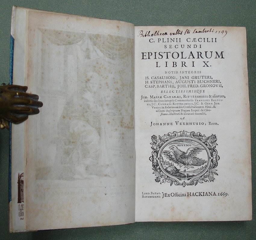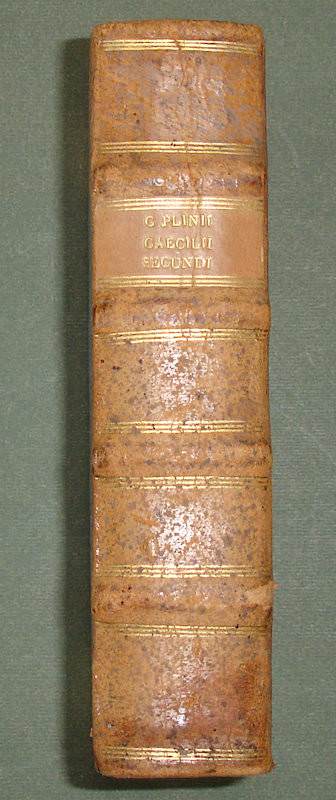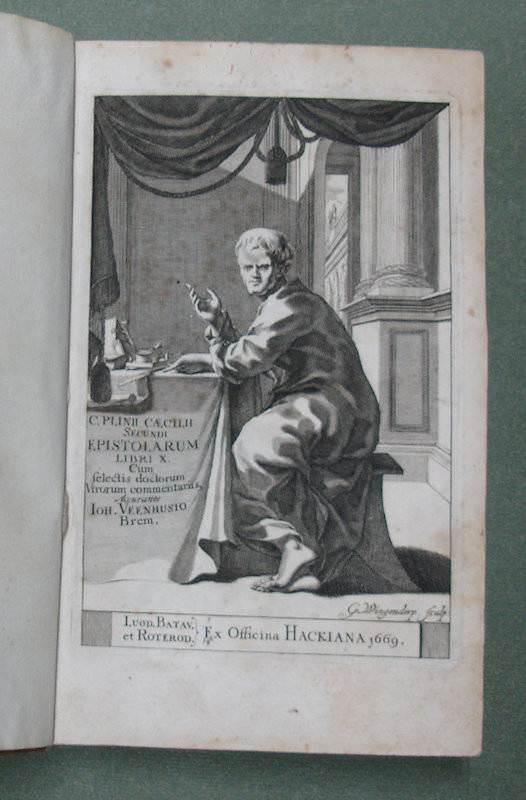 8vo. (LII),818,(23 index),(1 blank) p., frontispiece. 19th century half calf. 19.5 cm ‘We shall have reason to congratulate ourselves on the acquisition of so elegant and desirable an edition’ (Ref: STCN ppn 840239440; Schweiger 2,809; Brunet 4,722: ‘bonne édition’; Fabricius/Ernesti 2,415, among the ‘meliores editiones’; Dibdin 2,331: ‘is one of the scarcest and most valuable of the octavo Variorum classics’; Moss 2,494/95: ’the text of Pliny is correct, and the select notes of Veenhyseen (sic) do great credit to his learning and judgment’; Ebert 17351: ‘eine der bessern Augaben cum notis varior.’ Graesse 5,347/48) (Details: Back ruled gilt, and with 4 raised bands. The frontispiece, engraved by G. Wingendorp, depicts Plinius at his desk, in front of him 2 quills and an inkpot. Woodcut printer’s mark on the title, depicting a soaring eagle, motto ‘Movendo’. Dibdin adds: ‘and whether we consider the elegance of its typography, the accuracy of the text, or perspicuity of the notes, we shall have equal reason to congratulate ourselves on the acquisition of so elegant and desirable an edition’. Winckelmann used this 1669 edition of Pliny when he visited the Laurentine Villa (Ep. II,17) of Pliny) (Condition: Binding slightly scuffed. Seven small wormholes at the foot of the spine. New endpapers. Ownership entry on the title. Some foxing) (Note: The Roman civilian administrator Gaius Plinius Caecilius Secundus, 61-112 A.D, published 10 books of literary letters, consisting of short essays, character sketches and sensible observations. The letters paint the high society of the young Roman empire. The ninth book contains Pliny’s correspondence with the emperor Trajan. Pliny is famous for his description of the eruption of the Vesuvius on the 24th of August in 79 A.D. He was a nephew of the encyclopedist Pliny the Elder, who died, observing the eruption from afar, overcome by poisonous fumes. Pliny the Younger held under Trajanus a number of magistracies. In 111 or 112 he became governor of Bithynia. From here he was in constant correspondence with the Emperor. His letters, which were conceived of as artistic productions, are more or less epistolary essays. In the late antiquity and later in the Renaissance the literary letter had a widespread influence. § The German classical scholar Johannes Veenhusius of Bremen, 1643-1675, published the ‘Epistulae’ with the complete commentaries of Casaubon, Gruterus, Henri Estienne, Buchnerus, Barthius, Johannes Fredericus Gronovius, and with select notes of Cattaneo, Ritterhusius, and himself. The emendations of Gronovius are published here for the first time. Added are Henri Estienne’s ‘Praefatio’ and Conrad Lycosthenes’ ‘Vita Plinii’, Boxhornius’ essay on Pliny’s alleged Christianity, and the notes of Balduinus, Ritterhusius and the Vossii. For his text of the ‘Epistulae’, Veenhusius generally follows Estienne/Cattaneo, even when he reports in the footnotes the notes and the comments of other scholars who disagree with or correct the text he is printing. To confirm Pliny’s authorship of book 10, he reprints at the beginning of that book the dedicatory letter of Giovanni Maria Cattaneo, who published an edition of Pliny’s letters in 1506, to Ambrogio del Maino. In his own dedication to the officials of the city of Bremen, Veenhusius speaks of the difficult task of an editor. But he affirms that Pliny is an author worthy of their sponsorship; many of his letters deal with Roman law, which would be useful to compare with common law, and many contain learned observations about antiquity and politics, which are not only useful but also necessary to know. (‘Catalogus Translationum Et Commentariorum: Mediaeval and Renaissance Latin translations and commentaries, annotated lists and guides’. Volume IX, editors V. Brown,J. Hankins,R. A. Kasterp, Washington, 2011, p. 94) § Not much is known about Veenhusius, he is not to be found in ADB and NNBW. At the beginning of the ‘dedicatio’ to this edition he calls himself Johannes Veenhusen, and Bremen his ‘Patria’. In 1671 he produced for the Leiden publisher Hackius another ‘Variorum’ edition, now of Statius.) (Provenance: On the title ‘Bibliotheca vallis Sti Lamberti, 1749’. We found on the internet one book with exactly this same provenance: ((crlv))((org))/bibliographie-des-voyages/1203. The Cistercian abbey Val St. Lambert was situated in Seraing, Southwest of the Belgian city of Liège. It was founded in 1202 and closed down in 1796. Nowadays it is a crystal glass factory. (See Wikipedia ‘Val-Saint-Lambert’). On the front flyleaf the name of the Dutch specialist of Roman law ‘J.W. Tellegen’. On the front pastedown a small label of ‘Libreria dello Studente, Add.: Paolo Franchini, Firenze’) (Collation: *-3*8, 4*2; A-3G8 (leaf 3G5 verso blank; minus leaf 3G6, 7 & 8) (Photographs on request)