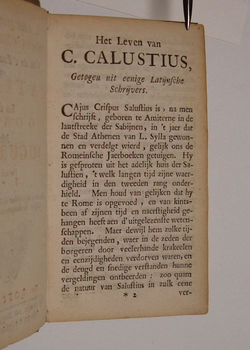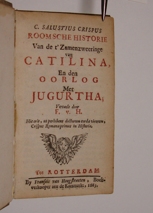 12mo. (XVI),98,(2),196 p. Vellum 13 cm (Ref: Geerebaert 132,3; OiN 331; Schweiger 598; In NCC 5 copies) (Details: 5 thongs laced through the joints. Title printed in red and black) (Condition: Vellum slightly soiled) (Note: ‘One of the most widely read and influential of Roman historians, along with Caesar, Livy, and Tacitus, Sallust (86-34 BC) has been studied, quoted, and imitated not only as a historian but also as a moral philosopher, political thinker, and stylist.’ Until 1600 more than 200 editions of his work appeared. Sallust was used in the 16th and 17th century to support absolute theories of government. But, ‘on the other hand, it was the republican Sallust, ‘ennemy of tyrants,’ whom John Milton admired and who bolstered the cause of liberty in the Lowlands during the war with Spain and, later, in France and on the American continent’. (The Classical tradition, Cambr. Mass., 2010 p. 856) Sallustius furnished indeed weapons to the supporters and opponents during the rebellion of the Netherlands against the Spaniards, a war of independence that lasted 80 years, from 1568 till 1648. Numberless pamphlets appeared during this war, and many are full of reminiscences and quotations of classical authors. Sallust also was widely used. William of Orange e.g. was once called ‘desen seditieuse Catalina’ (P.A.M. Geurts, ‘Sallustius’ Catilinae Coniuratio in politieke pamfletten’. In Hermeneus, 32, 1961. p. 113/7) The translator of both works is the publisher François van Hoogstraten, 1632-1696. He was a literary minded publisher, who wrote some poetry and translated Boethius, Thomas Morus, and the ‘Laus Stultitiae’ of Erasmus. (NNBW 8,833/34) (Collation: *8, A-M12 N4) (Photographs on request)