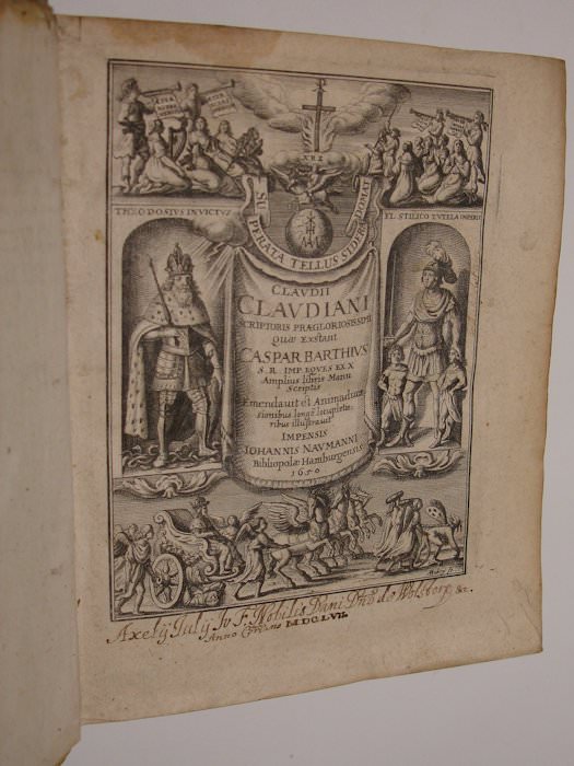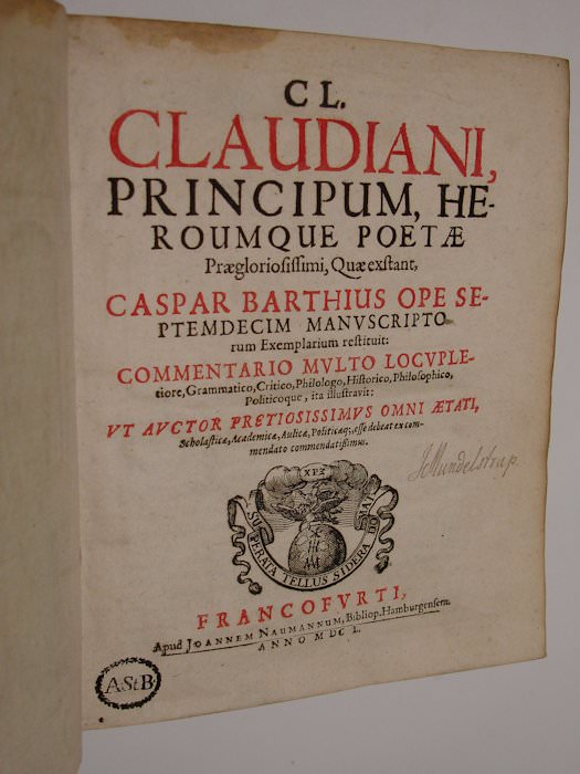 Cl. Claudiani Principum, Heroumque Poetae praegloriosissimi, Quae exstant. Caspar Barthius ope XVII manuscriptorum exemplarium restituit; commentario multo locupletiore, grammatico, critico, philologo, historico, philosophico, politicoque, ita illustravit, ut Auctor pretiosissimus omni aetati, scholasticae, academicae, aulicae, politicaeque, esse debeat ex commendato commendatissimus.