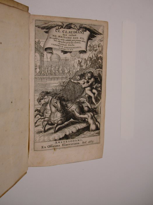 8vo. (XXVIII),917,(15 index) p. Vellum 20 cm (Ref: Schweiger 2,283/84; Dibdin 1,471: ‘in fact the best Variorum edition’; Moss 1,377: ‘a very correct and valuable edition’ and ‘This is one of the very scarcest of the Variorum editions’; Graesse 2,194; Ebert 4757; Brunet 2,88; Ernesti, Bibl. Lat. 1774, 3,201: ‘sed optima est ed. a. 1665’; Willems 1350: ‘fort bien imprimé’; Rahir 1400; Berghman 2036; Spoelder, Enkhuizen 1, p. 554) (Details: Prize copy, prize gone. 6 thongs laced through both joints. Gilt coat of arms of Enkhuizen within blind ruled borders on both boards. Engraved title depicting the rape of Proserpina, and the battle of the Giants against the gods. The notes are printed on the lower half of the pages, below the text) (Condition: Vellum varnished, the bad result is a gleaming binding with a few brownish strokes. Gilt fading. 4 thongs on the front joint broken. All 4 ties gone. Small bookplate on the front pastedown. Name on front flyleaf) (Note: This is the second edition of the works of the Roman poet Claudius Claudianus produced by Nicolaas Heinsius, 1620-1681, who was the only son of Daniel Heinsius. It was first published in 1650. Nicolaas never held any academic post. Let us see what Sandys tells about this genius: ‘His practice in versification, his wide reading in classical and post-classical Latin, and his knowledge of Greek literature made him an accomplished scholar. As a textual critic he had acquired an extensive knowledge of various readings by his study of MSS’. And: ‘In making his selection from the vast mass of variants, he was guided by a fine taste and a sound judgement acquired by long experience’. And: ‘His editions of the Latin poets laid the foundation of the textual criticism of those authors, and he has thus obtained the title of ‘sopitator poetarum Latinorum.’ (Sandys 2,323/327). Heinsius consulted, he says in the praefatio, for his first edition some 28 manuscripts, ‘viginti enim & octo fere ad manum fuerunt, ut vides’. Among these were 2 from the University Library of Leiden, and 2 from the Bodleian. Also 2 that were in the possession of the successor of Plantin, the publisher Balthasar Moretus, manuscripts that were originally used for the Plantin edition of Claudian by Pulman. (Antwerp, 1571) Heinsius rebukes Pulman for having neglected one of these, which he calls ‘insignis’ and ‘probus’. Pulman used it sluggishly, ‘oscitanter’. Heinsius consulted also 3 manuscripts which the French librarian and collector of manuscripts Alexander Petavius (Petau) had send him, one of the Royal Library, one of his own, and one owned by J.A. de Thou (Thuanus). After his edition of 1650 Heinsius continued to consult during his diplomatic travels through Europe 10 ‘bis quini’ other excellent manuscripts containing texts of Claudian. Heinsius gives in the new praefatio to this second edition, written 14 years after the first edition, ‘ante annos hosce plus minus quatuordenos’ a dazzling account of the books and manuscripts he consulted for the new edition. We also get a glimpse of the huge network of scholarly friends of which Heisius was a member. This second edition was published, so the title says, by Cornelis Schrevelius, who took his doctoral degree in Paris as a Doctor of Medicine in 1627. Hence C.S.M.D., that is Cornelis Schrevelius Medicus Doctor. He taught classics at the Schola Latina at Leiden, where he had been raised himself. In 1642 he succeeded his father, Theodorus Schrevelius, as the rector (Moderator) of the school. He died in 1664, a few days after having completed this edition of Claudian. He raised at least 11 kids, and fell victim to the plague. (A.M. Coebergh van den Braak, Meer dan zes eeuwen Leids Gymnasium, Leiden, 1988, p. 47/55); includes also his portrait). The involvement of Schrevelius in publishing a new edition of Claudian was limited to the necessary, but ungrateful task of the beast of burden. He did, so the ’typographus’ (who must be Daniel Elzevier) tells us in his short address to the reader, all that is necessary for a better understanding of Claudian, producing excerpts from the commentaries and editions of the best scholars) (Provenance: An engraved armorial bookplate on upper pastedown of one ‘Joshua Ruddock’: a crown, with 3 strawberry leaves on it, and a ‘pearl’ in the center of the leaves, on top, an eagle with spread wings. On the front flyleaf the name of Lennart Håkanson, professor of Latin Literature at the Univ. of Uppsala, 1980-1987) (Collation: *8, 2*6, A-3M8 3N2) (Photographs on request)