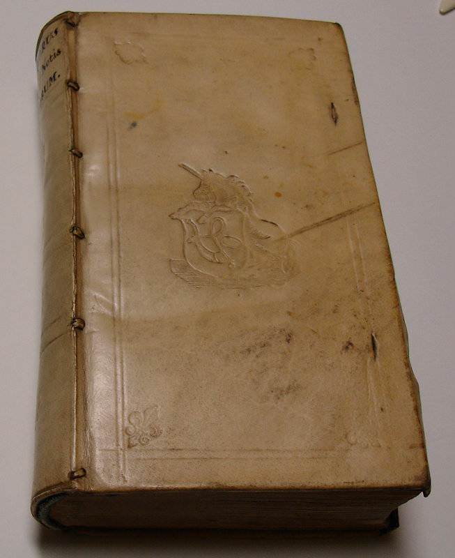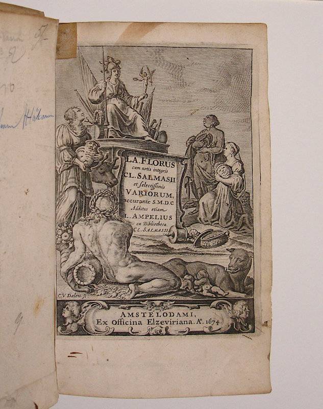 8vo. (XVI),588,(108 index),46,(2 blank) p. Overlapping vellum 20.5 cm (Ref: STCN ppn 842457577; Willems 1490; Berghman 2064; Rahir 1598; Schweiger 2,361; Ebert 7683. Spoelder p. 613, Hoorn 2) (Details: Prize copy, without the prize. 6 thongs laced through both joints. Blind stamped fleurs de lis on the back. Boards with blind double fillet borders, in the center of them the coat of arms of the city of Hoorn. Engraved title, depicting a throned goddess Roma on a pedestal, allegorical figures, representing Europe, Asia and Africa offer her their treasures; in the foreground Tibur, and little Romulus and Remus and their shewolf) (Condition: Prize gone. vellum age-toned, slightly soiled and scratched. All 4 textile fastening ties gone. Front flyleaf gone. Title slightly worn. Name on the front pastedown) (Note: ‘Favourite school-book in the 17th century’. This is the chief work of the Roman historian Lucius Annaeus Florus, who lived at the beginning 2nd century AD. It is an abridgement of Roman history with special reference to the wars waged up to the age of Augustus. Florus ‘shows a certain literary gift, marred, however, by a strong tendency to rhetoric. His brevity often entails obscurity, though he sometimes produces a felicitous epigram. (…) As an historian he is often inaccurate in both chronology and geography, but the work as a whole achieves a limited success as a rapid sketch of Roman military history. It was a favourite school-book in the 17th century’. (OCD, 2nd ed. p. 442) § This edition is a socalled ‘Variorum edition’. It offers a ’textus receptus’ which is widely accepted, accompanied with the commentary and the annotations of various specialists, taken or excerpted from earlier useful, normative or renewing editions. Editions like these, ‘cum notis Variorum’, were useful, but never broke new ground. The production of these sometimes overloaded editions was the specialty of Dutch scholars of the 17th and 18th century. The compilers seldom were great scholars, but often hard working schoolmasters. Their involvement in publishing a new edition was limited to the necessary, but ungrateful task of the beast of burden. § This Variorum edition was produced by, so the title says, S.M.D.C, that is by Cornelis Schrevelius, who took his doctoral degree in Paris as a Doctor of Medicine in 1627. Hence S.M.D.C., that is Schrevelius Medicus Doctor Cornelis. He taught classics at the Schola Latina at Leiden, where he had been raised himself. In 1642 he succeeded his father, Theodorus Schrevelius, as the rector (Moderator) of the school. He died in 1664, a few days after having completed an edition of Claudian. He raised at least 11 kids, and fell victim to the plague. (A.M. Coebergh van den Braak, Meer dan zes eeuwen Leids Gymnasium, Leiden, 1988, p. 47/55) § This edition of 1674 is a reissue of the Elzevier edition of 1660. The commentary of the French scholar Claude Saumaise, latinized as Claudius Salmasius, 1588-1653, was adopted from the Elzevier edition of 1638, which edition included also the ‘editio princeps’ of the ‘Liber Memorialis’ of Lucius Ampelius. Salmamius was since 1631 professor at the University of Leiden) (Provenance: On the front pastedown in ballpoint: ‘Lennart Hakanson’, 1939-1987, professor of Latin at the university of Uppsala) (Collation: *8, AQ-2Z8, 3A4 (leaf 3A4 blank)) (Photographs on request)