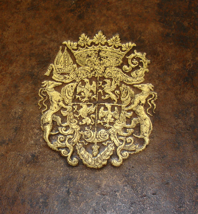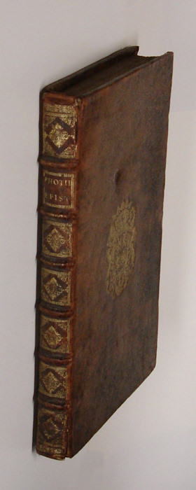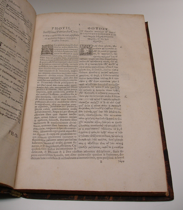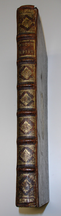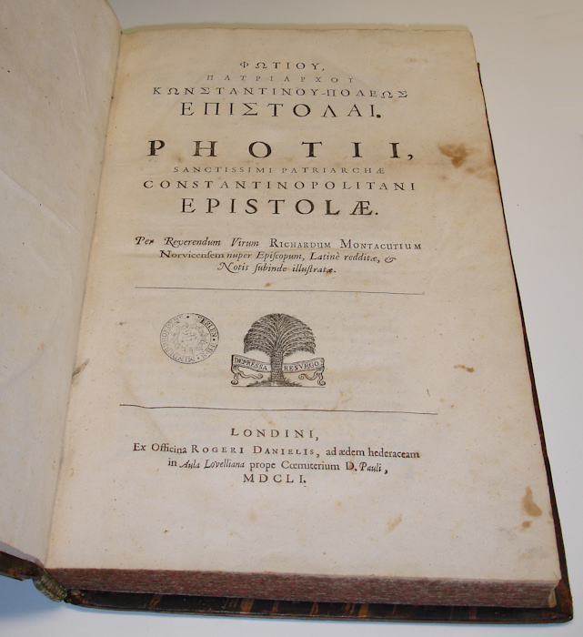 Folio. (8), 393,(1 blank),(10 index) p. Contemporary calf. 35 cm (Ref: ESTC R12714; Hoffmann 3,89; Brunet 4,624; Ebert 16779; Graesse 5,276) (Details: Gilt back with 6 raised bands. Gilt coat of arms on both boards. Woodcut printer’s device on the title, depicting a palm tree, the motto reads: ”Depressa resurgo’. ‘Oppressed, higher I rise’. Printed in 2 columns, Greek text of 248 letters, with parallel Latin translation. At the end have been added 5 letters ‘ex veteri codice orientali’) (Condition: Binding somewhat rubbed. Upper & lower part of the front joint split over 4 and 6 cm. Tiny bump in front board. Small stamp on the title. Small hole in the text of leaf 2A2) (Note: This edition is the ‘editio princeps’ of 248 letters of the great Byzantine scholar Photius, ca. 810 – ca. 893, who was Patriarch of Constantinople from 858 to 867, and from 877 to 886. He was the leader of the Byzantine Renaissance, and left works of immense value. The most important is the ‘Bibliotheka’, a critical bibliography of 280 works with his comments. Gibbon said that it was a living monument of erudition and acute criticism. This work is often the best and only source of notable works now lost. Photius also compiled a ‘Lexikon’, a glossary drawing upon earlier lexicographic works. The ‘Mystagogia’ is a theological work treating the Trinity. The ‘Amphilochia’ or ‘Quaestiones ad Amphilochium’, concerns ca. 300 catechetical question-and-answer discussions of religion and philosophy. § The surviving letters of Photius, 298 or 299, were written between 859 and 886, i.e. from the beginning till the end of his Patriachy. They show the same acute criticism and learning as his other works. It is thought that there were two collections of letters during Photius’ lifetime. The first contained the letters 1/248, and was compiled ca. 875. The second corpus contained the letters 1/283 and it dated from ca. 886. The first collection, 1/248, was first published in 1651, with a Latin translation and notes, by the well known English Greek scholar Richard Montagu, bishop of Norwich, (1577-1641) from a manuscript in the Bodleian Library. At the end have been added 5 letters, with a translation, from a manuscript brought to England by Chr. Ravius. Montagu’s first fruit was an edition of the Invectives of Gregorius Nazianzenus against the emperor Julianus Apostata, which was published in 1610) (Provenance: Coat of arms on boards: a shield with 2 eagles and 2 griffins in the quarters, flanked by 2 collared and lined greyhounds standing on the hindlegs. Above the shield a ducal coronet, left of the crown a bishop’s mitre, on the right a crosier. Stamp on the title: ‘Minderbroeders, Heerlen’) (Collation: A-3D4, 3E6) (Photographs on request) (Heavy book, may require extra shipping costs)