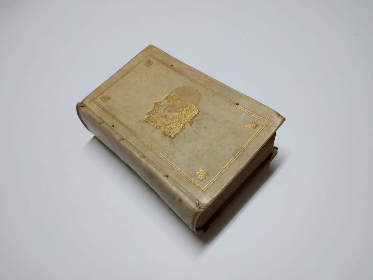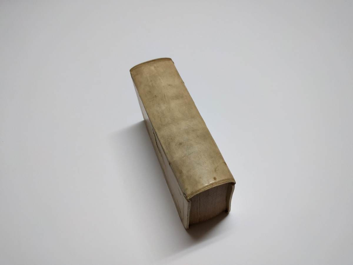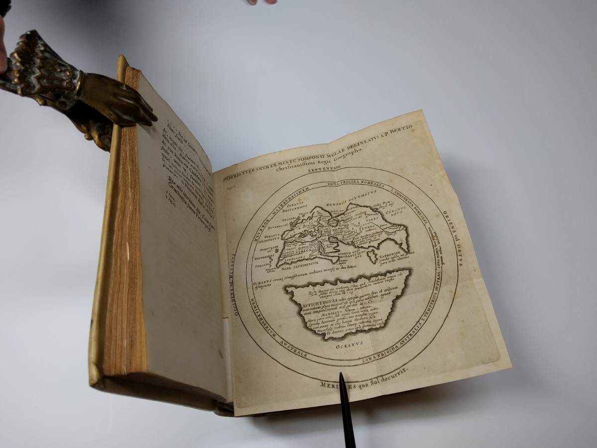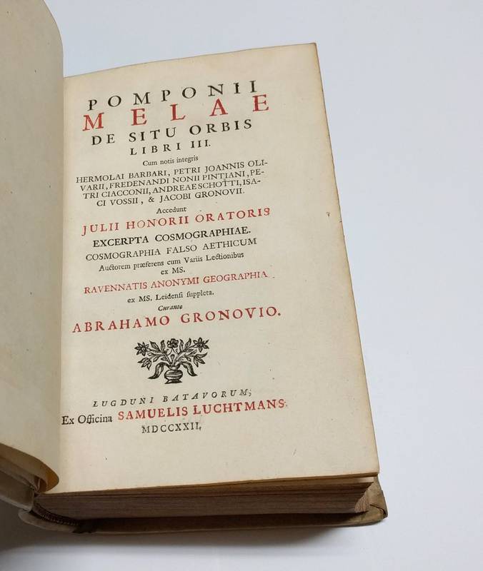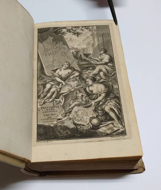 8vo. (LXXX),811,(36 index),(1 blank) p., frontispiece, folding map. Vellum 21 cm Prize copy (Ref: STCN ppn 238632024; Schweiger 2,611; Brunet 4,801; Dibdin 2,356; Graesse 5,402/403; Ebert 13632; Spoelder p. 683, Utrecht 3) (Details: Prize copy of the ‘Gymnasium Hieronymianum’ at Utrecht, without the prize. Gilt coat of arms of Utrecht within gilt borders on both boards. 6 thongs laced through the joints. The frontispiece, designed by H. van der My and etched by F. Bleyswyck, depicts a cartographer drawing a map of the world, in the foreground 2 women, one is a cartographer inspecting a map with rule and compass, the other is an archaeologist busy inspecting ancient treasures. Title printed in red and black. The folding map of the earth according to Mela at the beginning of the text is by ‘P. Bertius, christianissimi regis geographus’. Engraved text illustrations of coins. 1 full page illustration of 2 sculptured scenes from reliefs ‘in hortis Mattheis’ (p. 117) The first 304 pages contain the text and commentary. The rest of the book is filled with the annotations of earlier important scholars, especially Isaac Vossius. His observationes fill the pages 316-606. At the end we find Julius Honorius’ ‘Excerpta quae ad Cosmographiam pertinent’ (p. 685-702), the ‘Cosmographia antehac temere Aetico adscripta’ (p. 703-733), and the ‘Ravennatis Anonymi Geographiae libri quinque’ (737-811)) (Condition: Binding slightly soiled. Prize gone. All four ties gone. Name on the front flyleaf. Prize removed) (Note: Pomponius Mela, a geographer from the South of Spain, wrote in 43/44 under Claudius the first surviving work on geography in Latin. Pomponius is foremost a writer: distances, directions and other useful information for sailors or travellers is lacking. His work was meant for the educated and curious Roman public. The work was known in the Middle Ages, and in the following centuries he was read at school. § The Dutch classical scholar Abraham Gronovius, 1695-1775, acted as librarian at Leyden University from 1741 until his death. He edited editions of the ‘Historiae Philippicae’ of Justinus, and two editions of Aelianus. He showed interest in geographical matters, and published at Leiden in 1739 his ‘Varia Geographica’. He based this new ‘Variorum’ edition of the geographer Mela Pomponius on an edition which was previously published in 1696 by his father Jacobus Gronovius, 1645-1716, who was professor Greek of the Unverstiy of Leiden) (Provenance: On the front flyleaf in ink: ‘Ex praemiis P.G. v. Poolsum 1731’. We found a Petrus Georgius van Poolsum, born in Utrecht in 1718, who became minister of the protestant church of Doorn in 1741. He died in 1772. Does the inscription mean that young Van Poolsum, age 13, received this prize in 1731? This seems possible, for he has the right age and was from Utrecht. Spoelder signals 3 copies of prizes with this type of coat of arms; they were awarded between 1689 and 1711) (Collation: pi1, *-5*8; A-3G8 (leaf 3G8 verso blank) (Photographs on request)