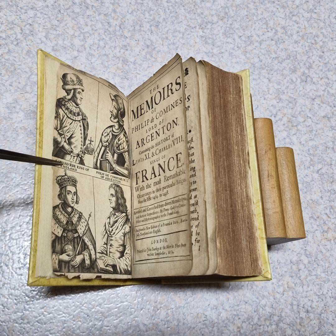 8vo. (XL), 479, 478-542, 553-611,(4 stocklist),(1 blank) p. Recent vellum. 19 cm Philippe de Commines has been called the Father of Modern History. (Ref: ESTC No. R7258) (Details: A frontispiece showing 4 portraits, of the King of France, Charles Duke of Burgundy, Edward VIIII King of England and of Philippe de Commines) (Condition: Endpapers renewed. The frontispiece attached to the title-page with a strip of paper. Edges of the frontispiece chipping, especially at the upper rim. First leaves soiled and thumbed. A few leaves of the introduction soiled too, some with paper repairs and chipping margins. Upper margin cut short, sometimes shaving the top of the running title. Paper somewhat foxed and yellowing) (Note: Philippe de Commines, or de Commynes, 1447 – ca. 1511, was a French author and diplomat of Flemish origin at the court of Burgundy and France. He has been called ’the first truly modern author’ and ’the first philosophical critic and historian since classical times’. His analysis of contemporary politics makes him unique. The ‘Mémoires’ of Commines is divided into two very different parts. The first six books tell the story from 1466 to 1483 and, in particular, the rivalry between Louis XI and Charles the Bold. The last two books, written by Commines at the end of his life, treat the Italian War (1494-1495). § Commines is a true historian, masterfully unravelling the most complicated issues. He takes the trouble to inform himself copiously and accurately, and always cites his sources. His story is generally accurate. For him history is a morality play, trying to extract from the narration of the events lessons for princes and heads of state. He recommends distrust of themselves, their friends, their relatives and fortune. Trickery is better than violence to reach the proposed goals. His political morality is very similar to that of Machiavelli, but more cautious. § The work remained in manuscript until 1524, when the first edition of the ‘Mémoires’, a title not used until an edition of 1552, was published, and was rather defective. The first truly critical edition was produced by Denis Sauvage, Paris 1552. He, as we saw, gave the work the title ‘Mémoires’. His division in books and chapters is accepted by all later editors. His edition remained the standard until 1649, when Denys Godefroy brought out from the Royal Press in the Louvre and of Louis XIV, a new one, with numerous corrections and additions. Our English translation of 1674 here on offer was made from this Parisian edition of 1649. The first English translation was published in London in 1596, and produced by the historian Thomas Danett. It was repeated in 1601, 1614, 1665 and 1674. This 1674 translation of Danett was printed in London for Samuel Mearne, John Martyn, and Henry Herringman, and should not be confused with our copy, which also saw the light in London in 1674, but is a new translation, based, as the title says, on the new corrected Parisian edition by Godefroy of 1649. We could not find out who this new translator was) (Collation: A8, A*4, a8; B-2Q8 (2Q8 verso blank). The pagination is erratic, but the work is collated and complete). (Photographs on request)